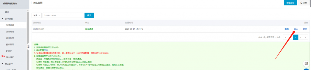 在控制台左侧导航栏里,单击 邮件设置 > 发信域名,进入 域名管理 页面。