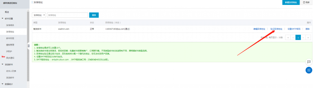 最后一步验证回信地址,填写一个可以收到信的邮箱,点击验证之后阿里云会发送一封验证邮件到你的回信地址,点击邮件链接即可验证通过