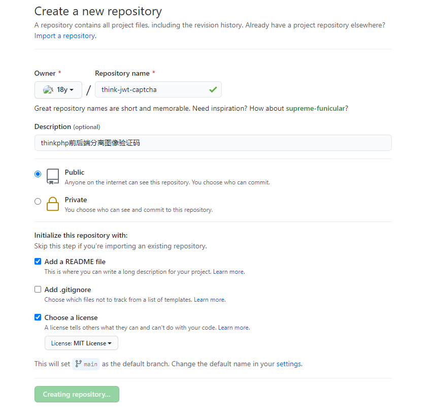 首先我们到github上建立一个仓库,名字就叫 think-jwt-captcha 好了。