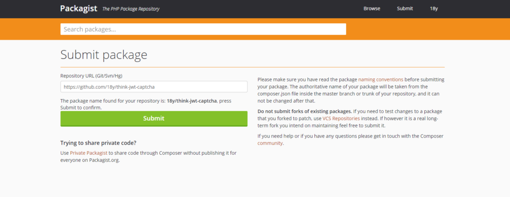- 在输入框中输入 GitHub 上的刚才包地址,如:https://github.com/18y/think-jwt-captcha