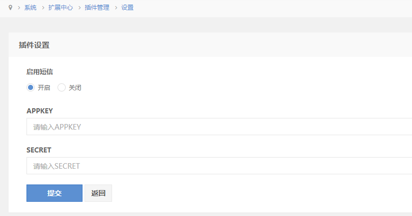 2. 在插件设置中,填写 APPKEY 和 SECRET, 也就是阿里云的APPKEY 和 SECRET