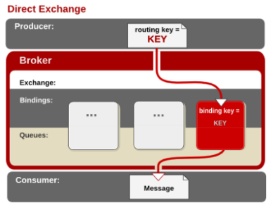 消息中的路由键(routing key)如果和 Binding 中的 binding key 一致, 交换器就将消息发到对应的队列中。路由键与队列名完全匹配,如果一个队列绑定到交换机要求路由键为“dog”,则只转发 routing key 标记为“dog”的消息,不会转发“dog.puppy”,也不会转发“dog.guard”等等。它是完全匹配、单播的模式。