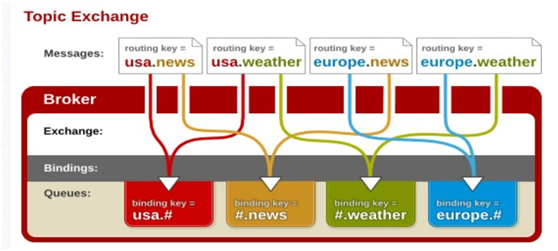 topic 交换器通过模式匹配分配消息的路由键属性,将路由键和某个模式进行匹配,此时队列需要绑定到一个模式上。它将路由键和绑定键的字符串切分成单词,这些单词之间用点隔开。它同样也会识别两个通配符:符号“#”和符号“”。#匹配0个或多个单词,匹配不多不少一个单词。