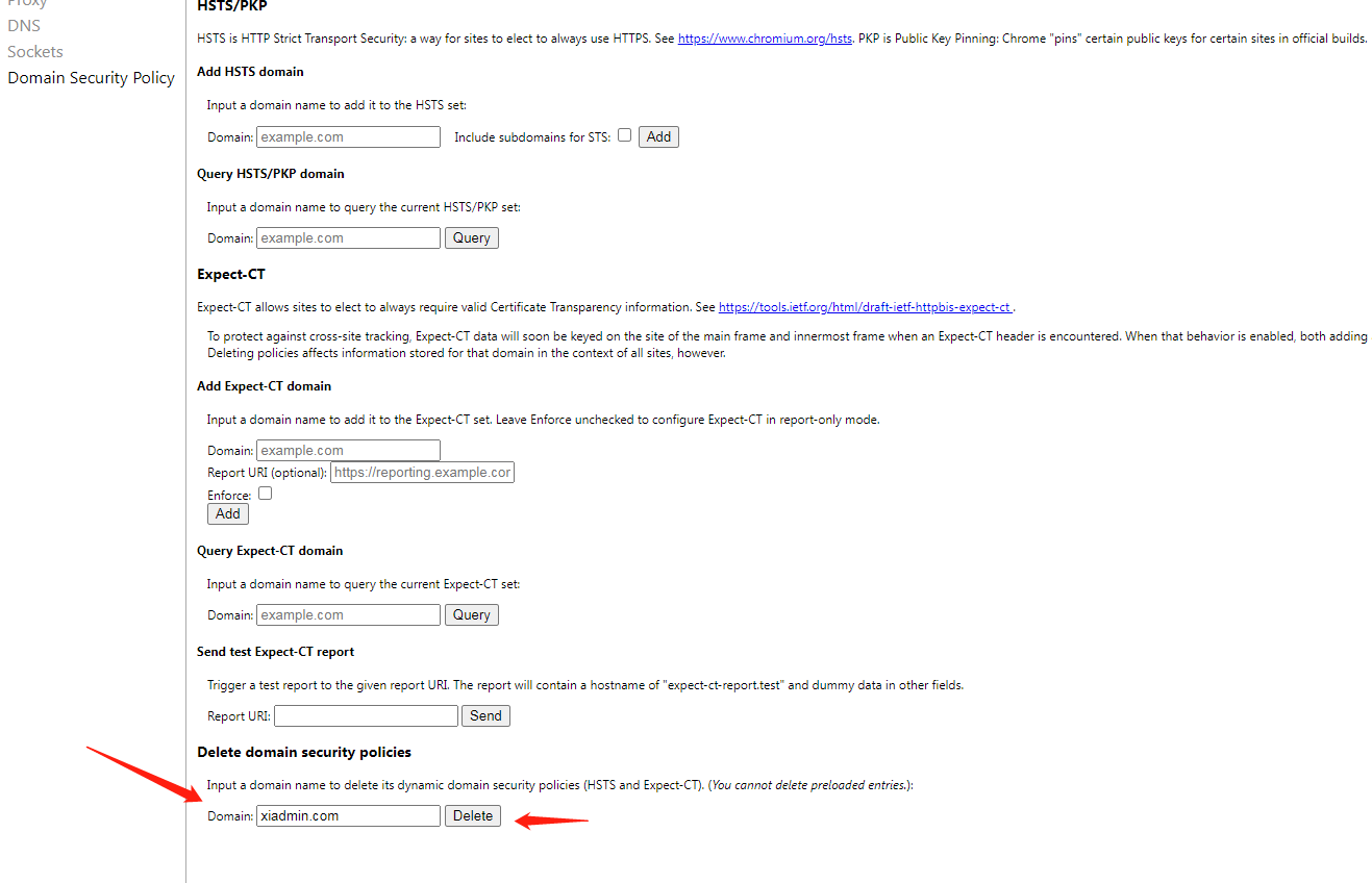在地址栏输入 se://net-internals/#hsts