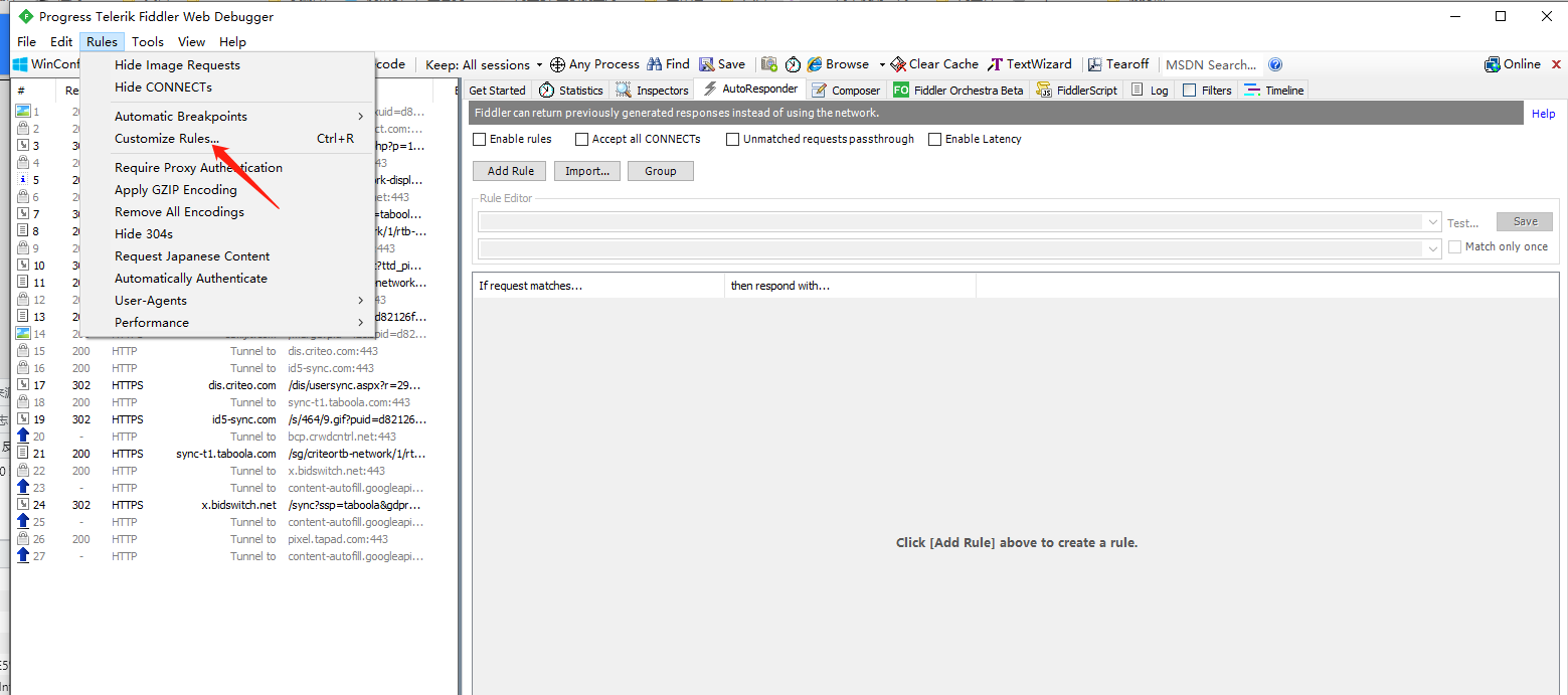 Rules->Custon Rules,或按Ctrl+R键,编辑 CustomRules.js 代码文件,在OnBeforeRequest函数里修改代码: