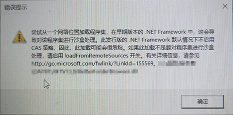 尝试从一个网络位置加载程序集,在早期版本的 .NET Framework 中,这会导致对该程序集进行沙盒处理。此发行版的 .NET Framework 默认情况下不启用 CAS 策略,因此,此加载可能会很危险。如果此加载不是要对程序集进行沙盒处理,请启用 loadFromRemoteSources 开关。